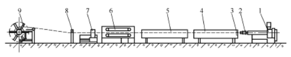 Seperti yang dapat dilihat dari Rajah 1, peralatan hiliran penyemperitan paip terutamanya terdiri daripada tangki air penyejuk,unit angkut, pemotong, gegelung, atau buang meja.