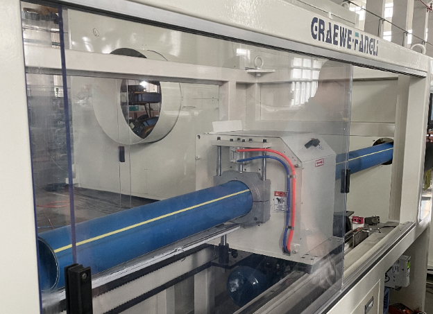 Keempat, paip diangkut oleh unit daya tarikan ulat dan dihantar ke dalam pemotong di mana paip dipotong mengikut panjang yang telah ditetapkan; pada masa yang sama, habuk pemotong dikeluarkan oleh penghapus habuk.
