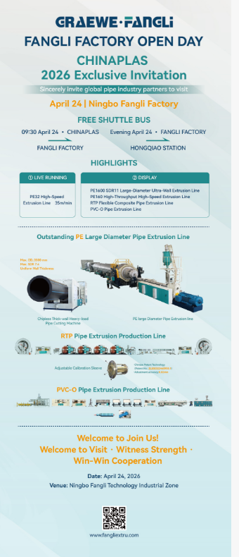 Dari 21 hingga 24 April di CHINAPLAS 2026, kunjungi Fangli Technology di gerai 7.1C14. Mari kita terokai inovasi dan kerjasama masa depan dalam peralatan paip plastik bersama-sama!